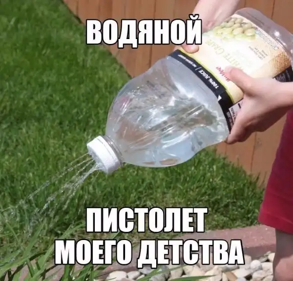А самый крутой был тот, кто достал пластмассовую бутылку объемом полтора-два литра, больше воды влезает! У нас только у одного была, не знаю даже из под чего?! Но все завидовали, потому что в бутылке из под шампуня вода быстро заканчивалась.