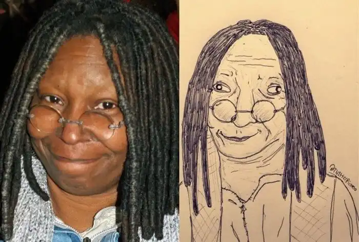 Чувство юмора у tw1tterpicasso проявляется не только в карикатурах, но и в колких описаниях. На карикатуре Вупи Голдберг он, например, пометил рэпера 2chainz, похожего на актрису стилем причёски.