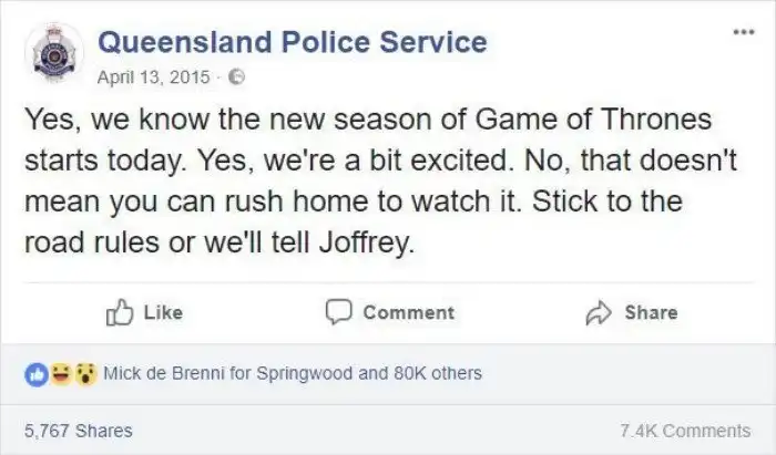 "Да, мы знаем, что сегодня начинается новый сезон "Игры престолов". Да, мы тоже немного взволнованы. Нет, это не означает, что вам можно нестись домой сломя голову. Соблюдайте правила дорожного движения, не то мы пожалуемся Джоффри".