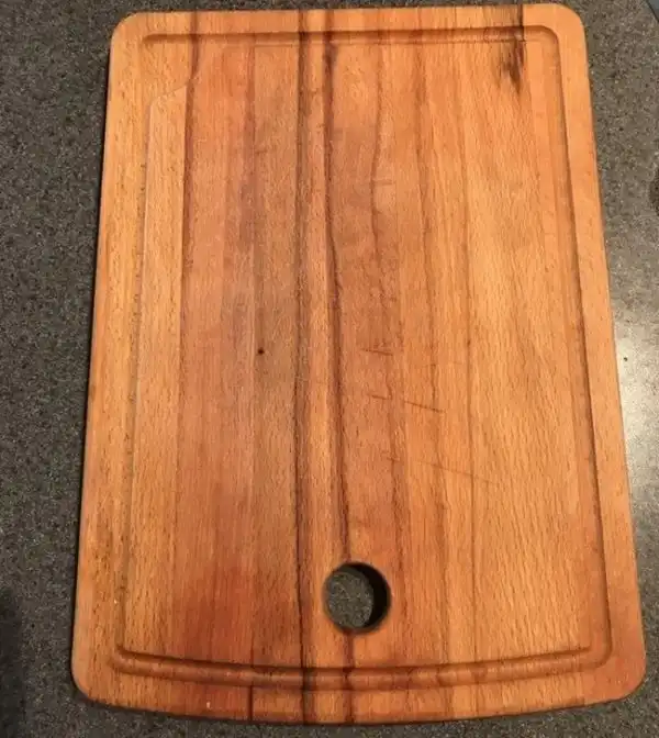 Эта разделочная доска имеет специальный желоб, куда должна при нарезке стекать жидкость от продуктов. Но это странное отверстие полностью отменяет эту опцию