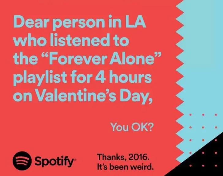 «Дорогой человек из Лос-Анджелеса, который прослушивал плей-лист „Forever Alone“ в течение 4 часов в День святого Валентина, с тобой все в порядке?»