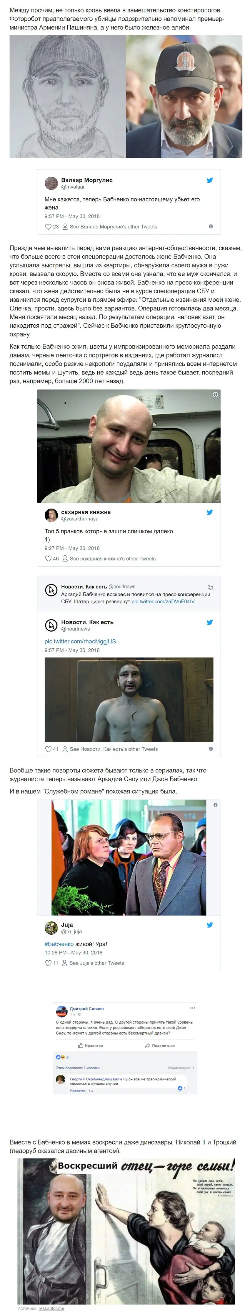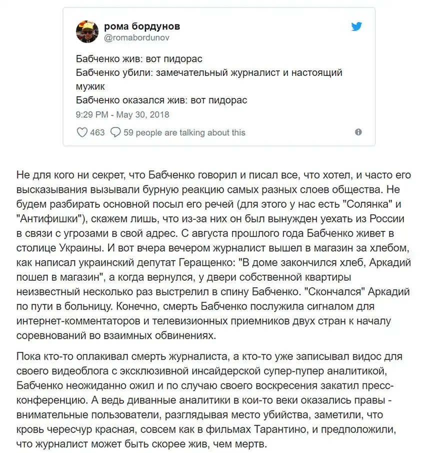 Воскреснуть в эпоху интернета - это случай особый. О таком даже не мечтал Том Сойер, ведь ему удалось послушать лишь несколько траурных речей земляков, набившихся в небольшую церковь, а у Бабченко был целый день, чтобы листать ленты соцсетей и читать некрологи про себя любимого. Теперь обо всем по порядку.