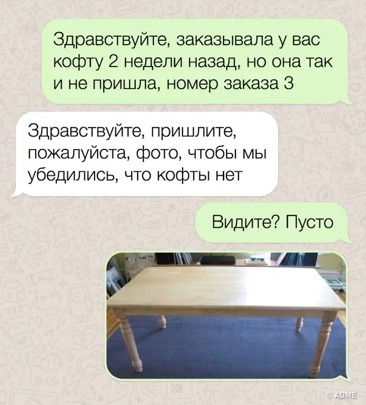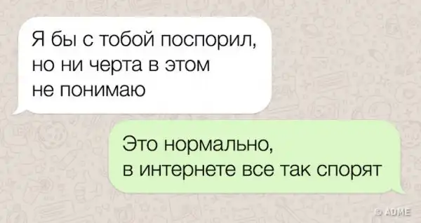 Как известно, в споре истина может не только родиться, но и благополучно потеряться. Так происходит и в СМС-переписке - сжатом диалоге, в котором чего только не бывает: искрометный юмор, беспощадная логика и полное непонимание. Например, в одном из сообщений нашей подборки человек из службы поддержки просит недовольного покупателя прислать фото, доказывающее, что товар не пришел. Ответ определенно сделает ваш день.