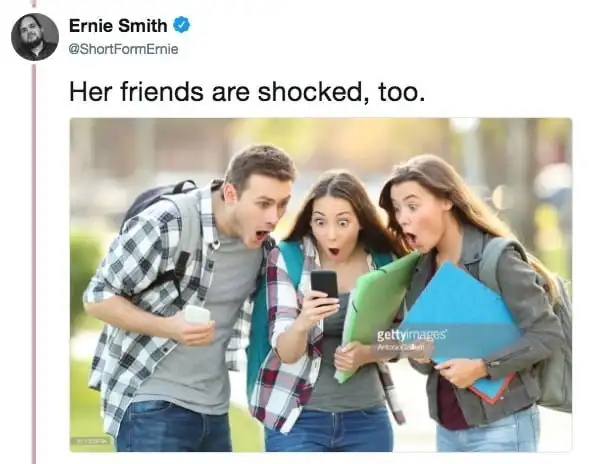 Помните недовольную и несколько шокированную девушку из интернет-мема "Неверный парень" (Distracted Boyfriend)? Тут интересное про нее нарыли: оказывается, есть куча стоковых фотографий, на которых изображена та же самая девица. И она абсолютно везде с таким лицом! Девушка в перманентном шоке, получается, и неверный бойфренд тут вовсе не при чем.