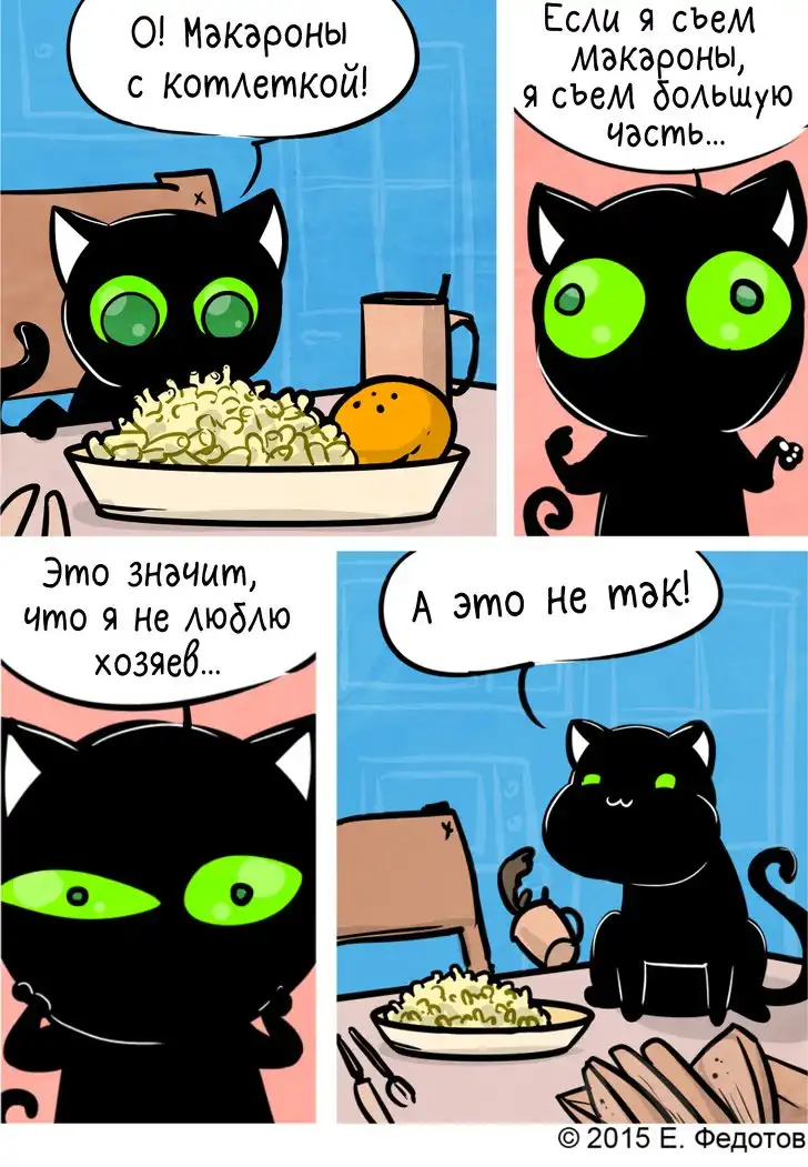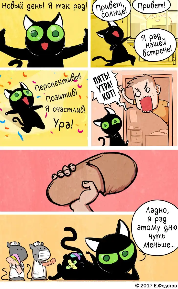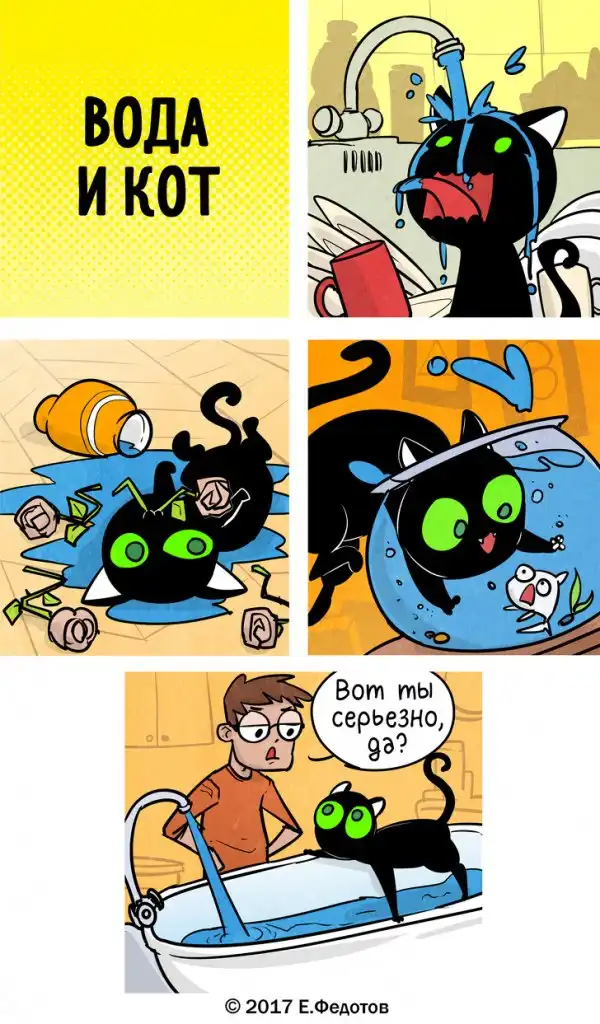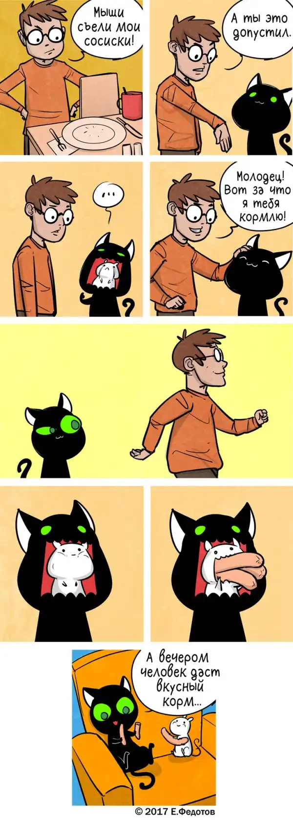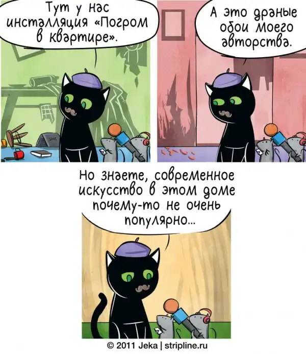 Художник из Москвы Евгений Федотов создает сетевой комикс «Кошки-мышки» уже более 9 лет. Его творчество понравится любителям мягкого, ничуть не пошлого юмора, легкой иронии и ненавязчивой житейской философии. Котовладельцы получат дополнительную порцию удовольствия, узнавая повадки своего питомца и находя неожиданные ответы на извечные вопросы, зачем он так делает и о чем он вообще думает.