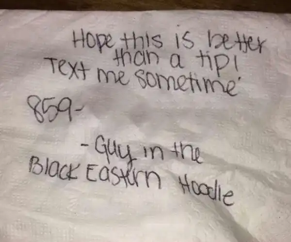«Надеюсь, это лучше чаевых. Напиши мне как-нибудь. Парень в черной толстовке».