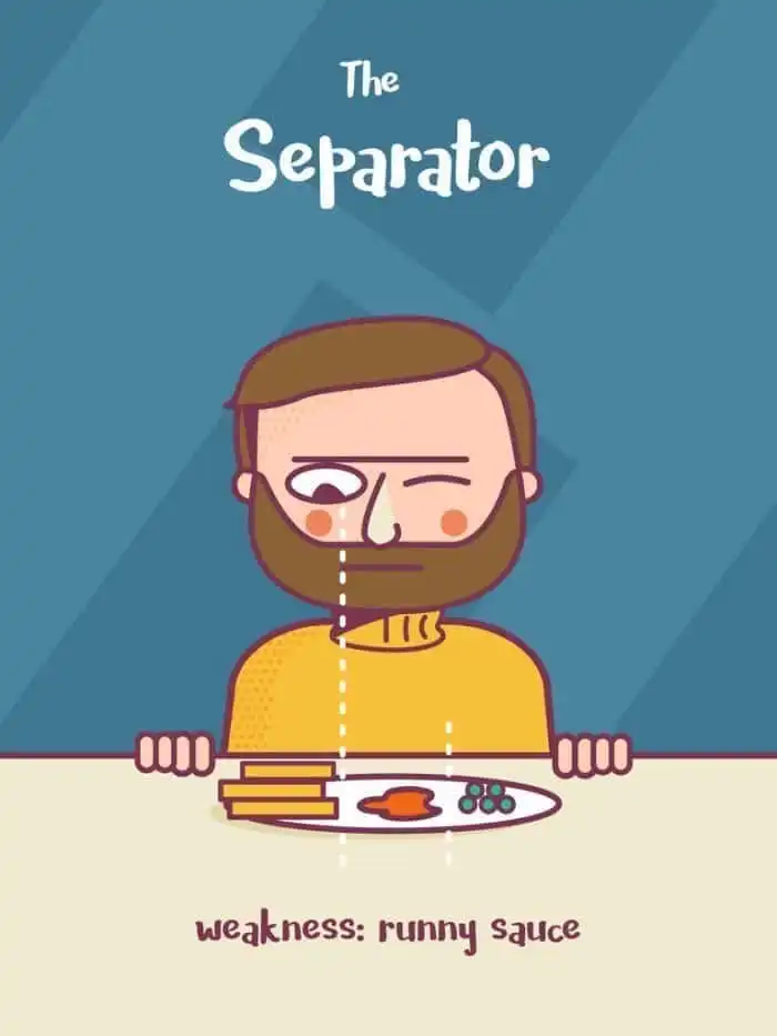 Эти люди просто не выносят смешивания продуктов. Поэтому их так раздражают соусы, которые так и норовят объединиться. Вы никогда не увидите, как сепартор окунает печенье в молоко, потому что вкусы и текстуры должны оставаться в первозданном виде.