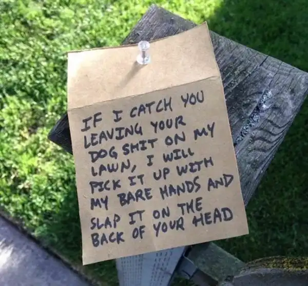 "Если я увижу, как ты оставляешь собачьи отходы на моем газоне, я возьму их голыми руками и размажу по твоему затылку".
