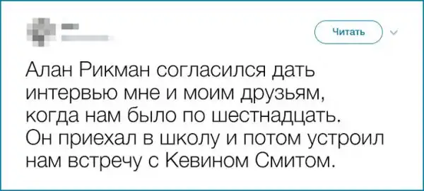 Принято думать, что знаменитости далеки от своих поклонников и встречают их только на раздаче автографов, но множество людей могут опровергнуть этот стереотип. Они рассказали о своих встречах со звездами в ответ на просьбу пользователя твиттера с ником BAKKOOONN. Невозможно не улыбнуться, читая эти полные тепла и восхищения истории.