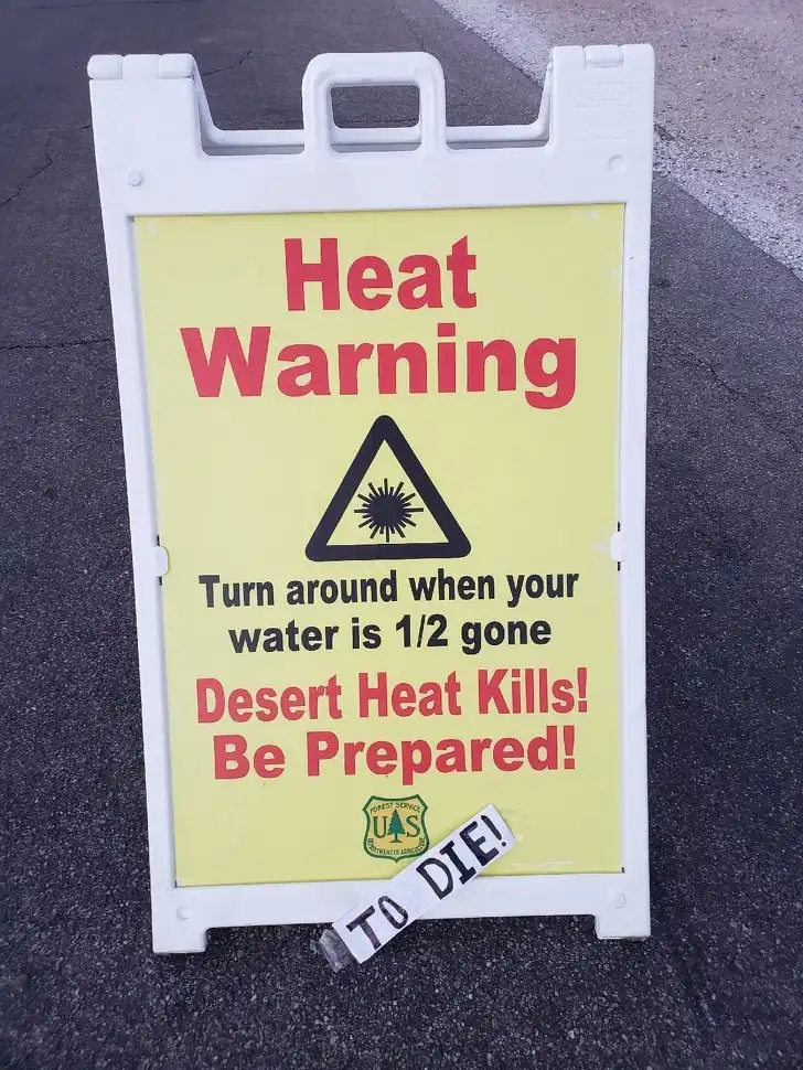 «Предупреждение. Поверните назад, если израсходовали свой запас воды наполовину. Жара в пустыне убивает! Будьте готовы!» «...Умереть».