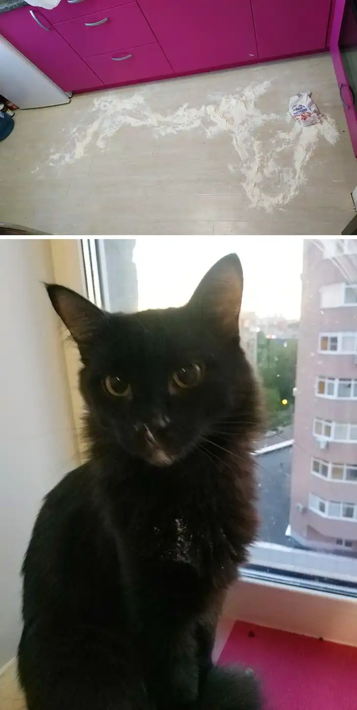 Взгляд кота как бы говорит: «А нечего было муку оставлять на столе»
