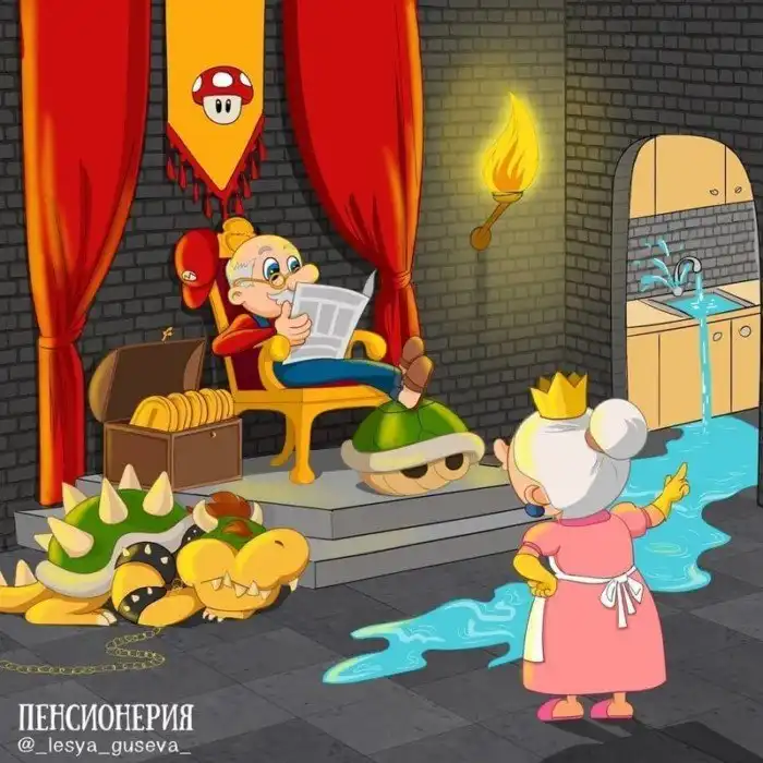 9. Марио думал, что хоть в старости спокойно поживёт, но нет, принцесса зовёт кран чинить. А кто ж ещё в замке водопроводчик?