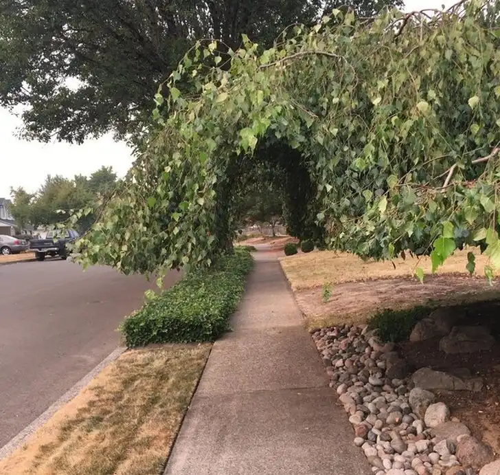 «Это дерево растет на участке моего соседа. Он вырезал арку в кроне, чтобы пешеходы могли свободно ходить по тротуару»