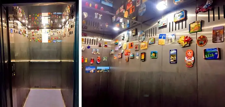 Так выглядит лифт в доме, где соседи любят путешествия. Кажется, на холодильниках места для магнитиков уже не хватает