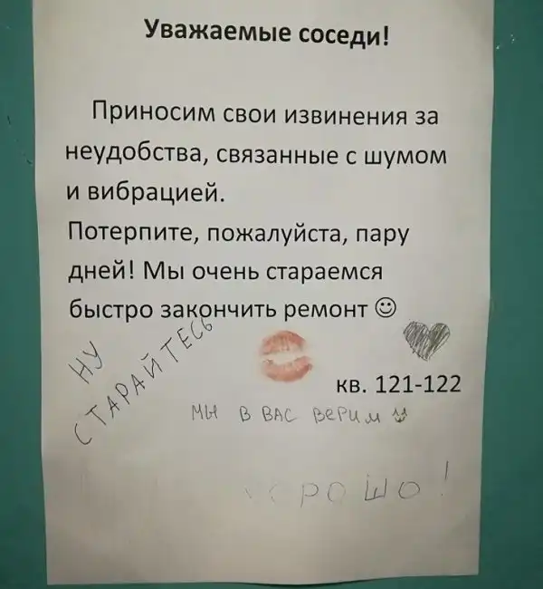 Согласитесь, покупка нового жилья часто напоминает лотерею: крайне сложно угадать, какие люди теперь будут жить с вами по соседству. И практика показывает, что от этих ребят можно ожидать буквально всего — от помощи по хозяйству до откровенного вредительства. Одни из них готовы испечь блинчики на ваш день рождения, других тянет расклеивать магнитики в лифте, а третьи честно вывешивают за окном предупреждение, что к ним лучше не соваться.