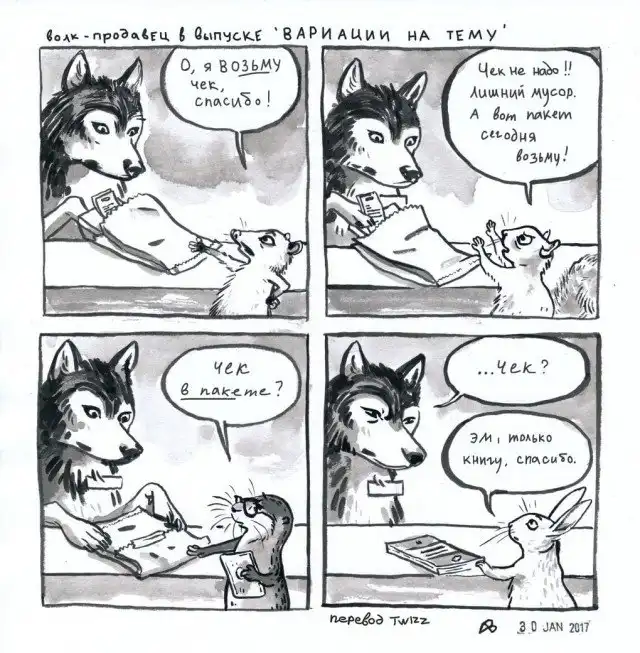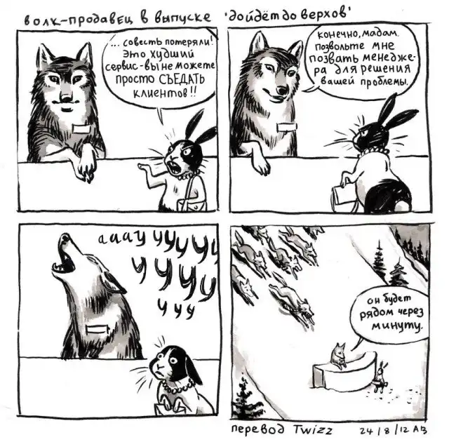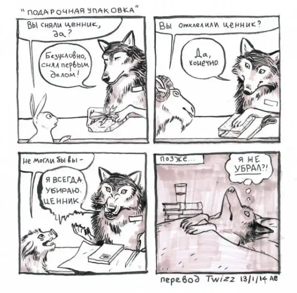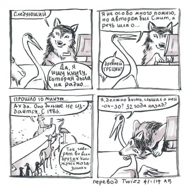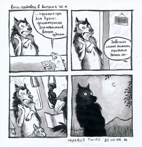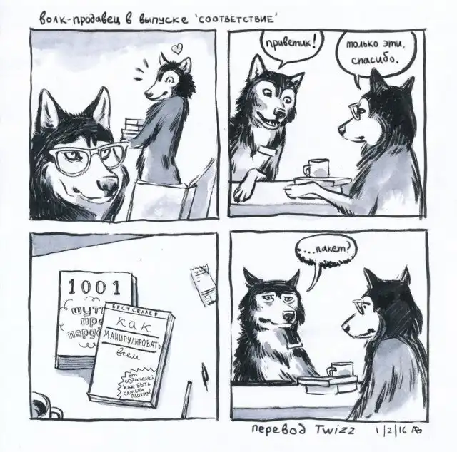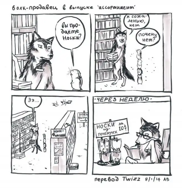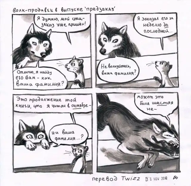 Попадали когда-нибудь в ситуацию, когда перед вами на кассе стоит человек, который решил задать продавцу кучу дурацких вопросов именно сейчас? Или же тот, кто вообще не определился, нужно ему что-то или нет? Если вы хотя бы раз имели дело с клиентами или покупателями, то вы наверняка поймёте чувства героя этих комиксов — волка, который работает продавцом в книжном магазине. Среди животных-покупателей то и дело находятся не самые приятные типы, и некоторые их диалоги непременно сумеют вас рассмешить.