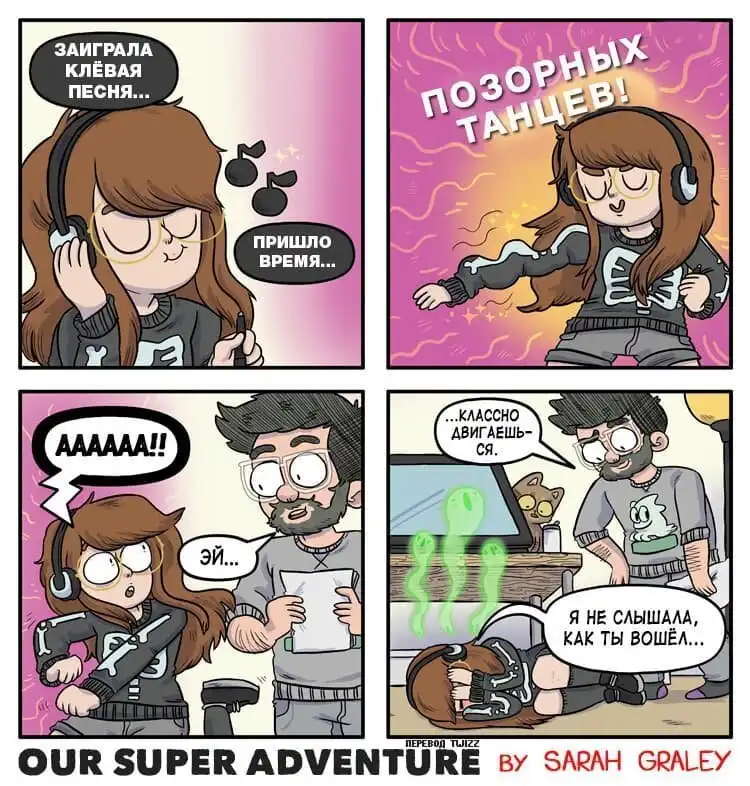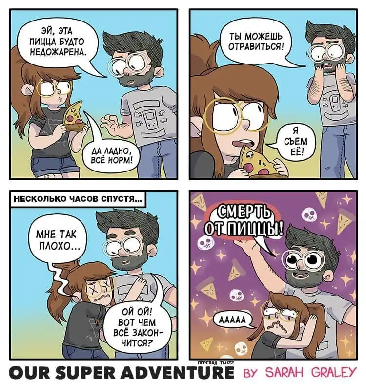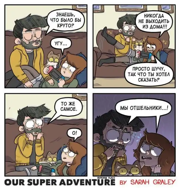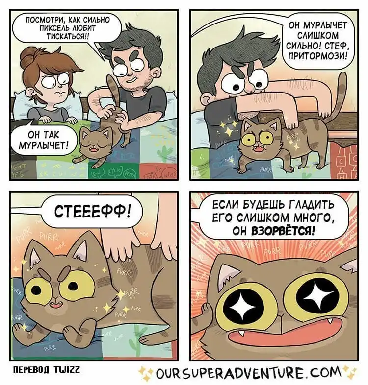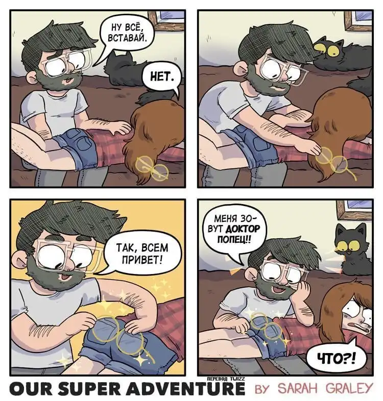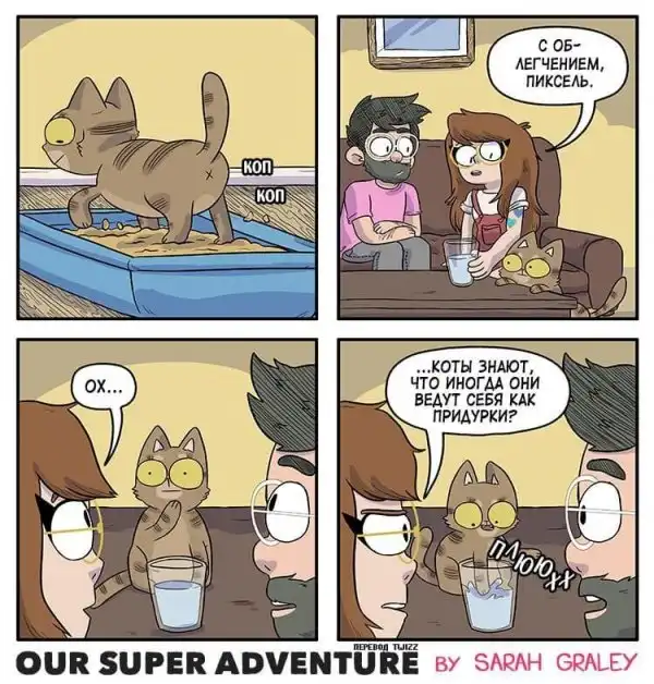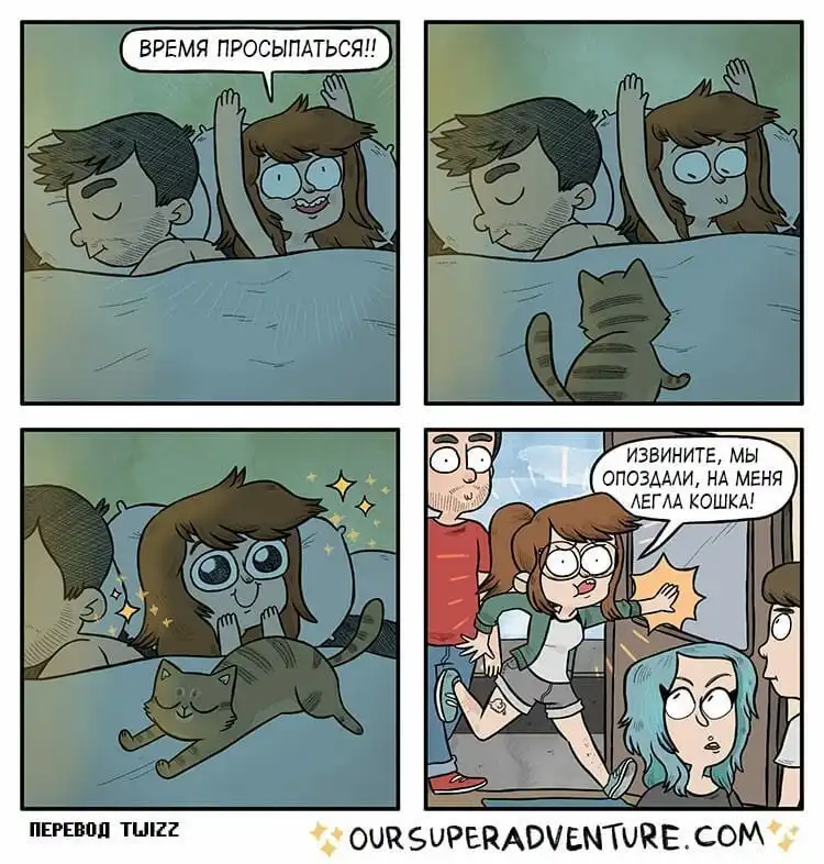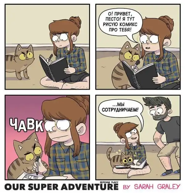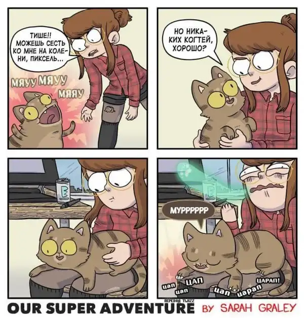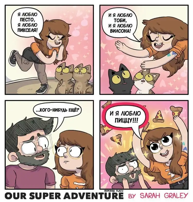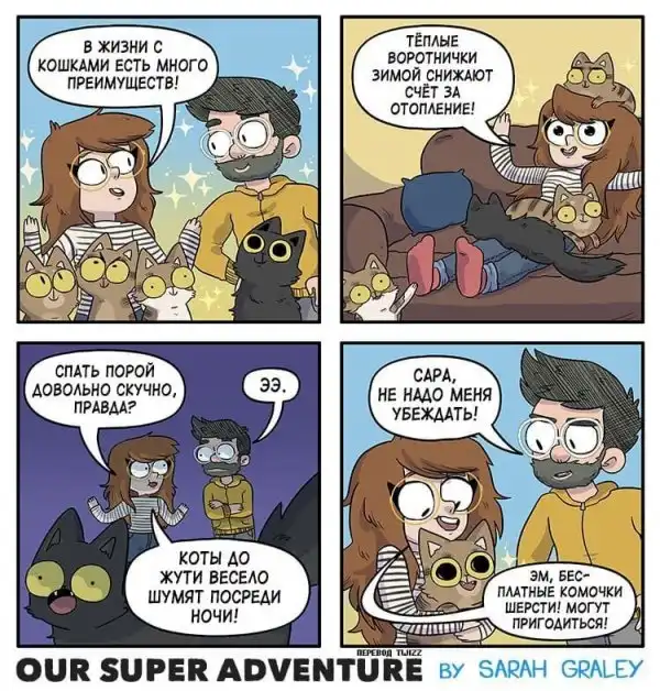Каково это — жить в одном доме с четырьмя кошками и похожим на них парнем? Ответ на этот вопрос прекрасно знает Сара Грейли — профессиональный иллюстратор из Бирмингема, Великобритания. Она не только помогает другим визуализировать их идеи, но и не забывает о себе. Так, Сара рисует комиксы «Наше суперприключение» о своей безумной жизни с котами и молодым человеком.