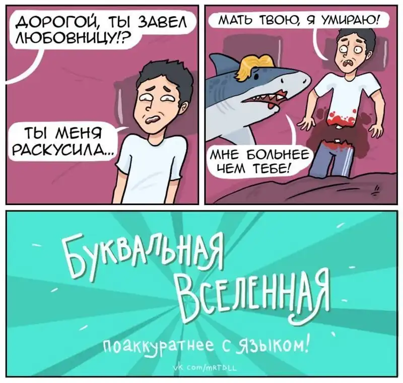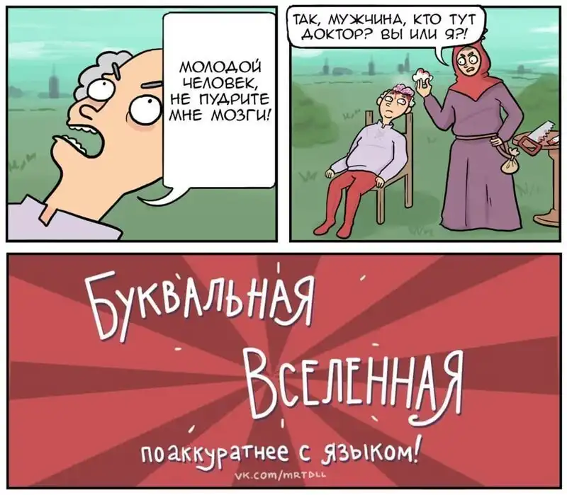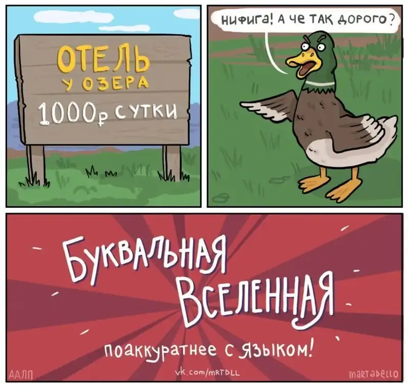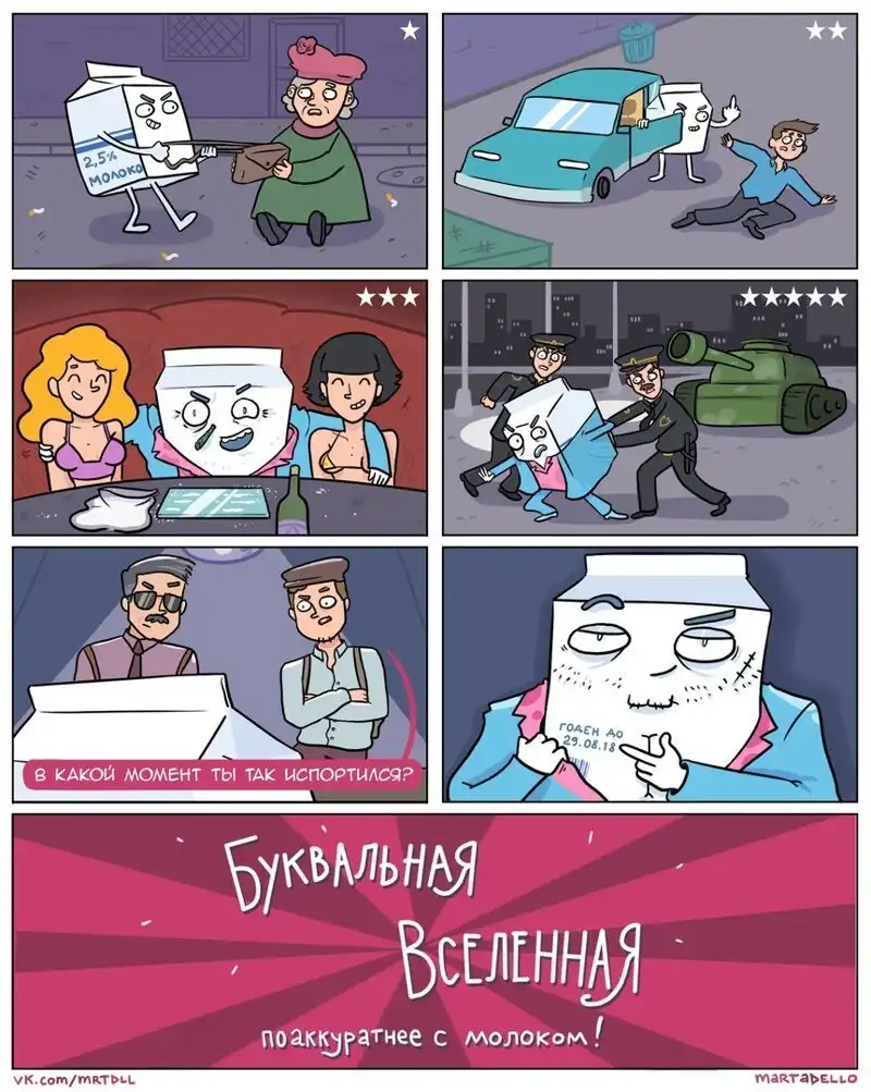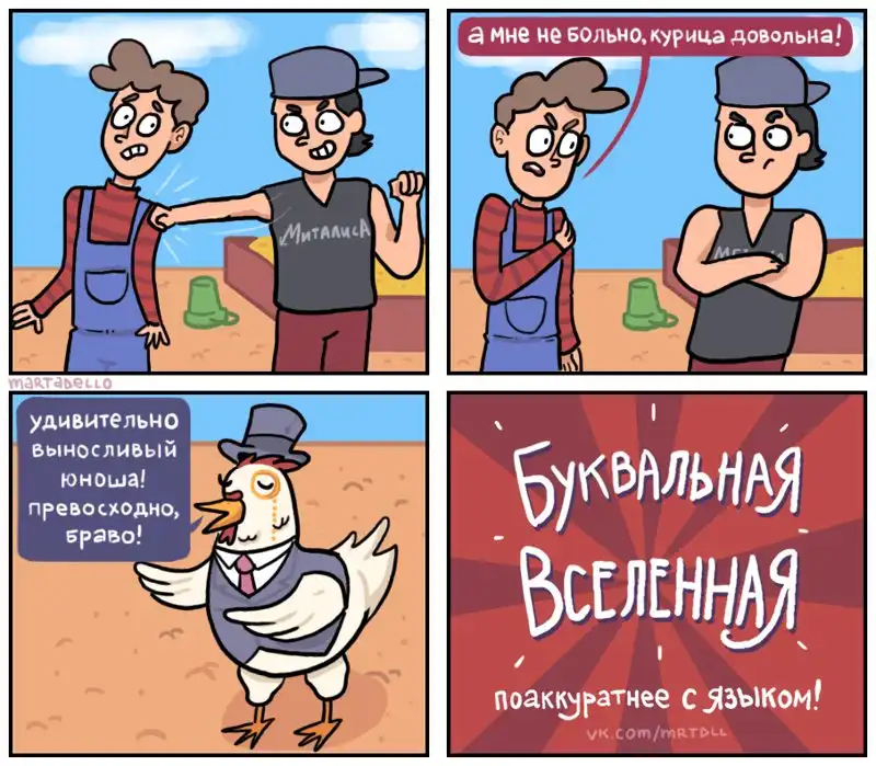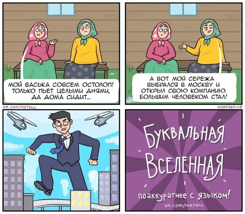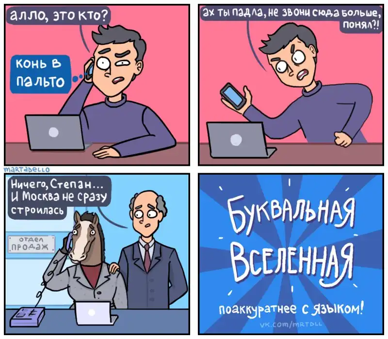 Автор комиксов под псевдонимом Martadello «проецирует жизнь в digital» и веселит нас сериями своих рисованных работ со своеобразными шуточками. Одним из таких циклов является «Буквальная вселенная», суть которой — превращать простые выражения с двумя и более смыслами в абсурдные визуальные истории.