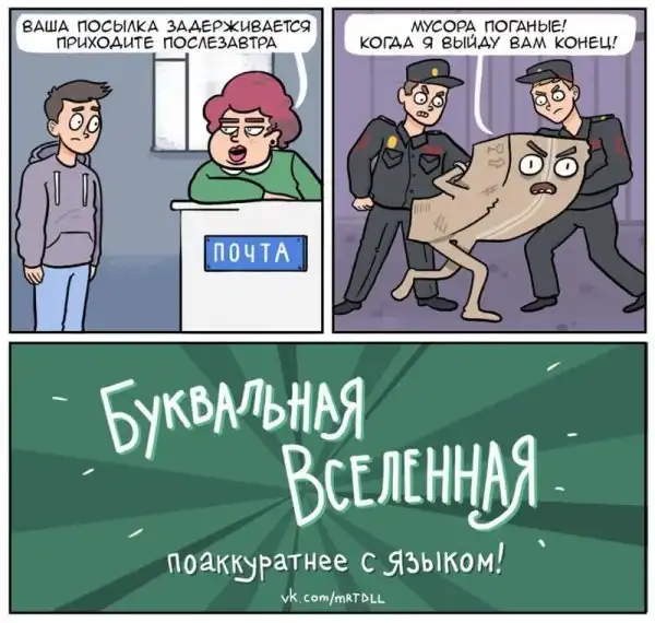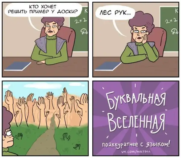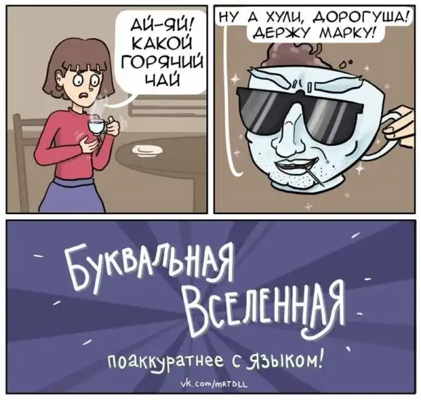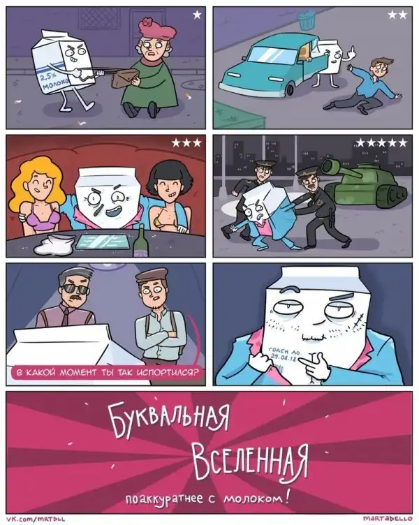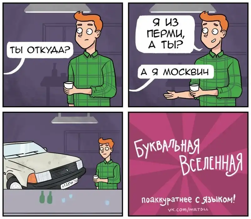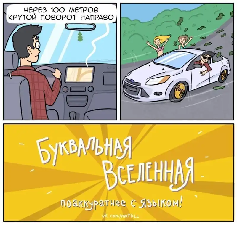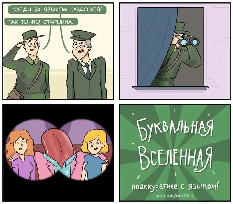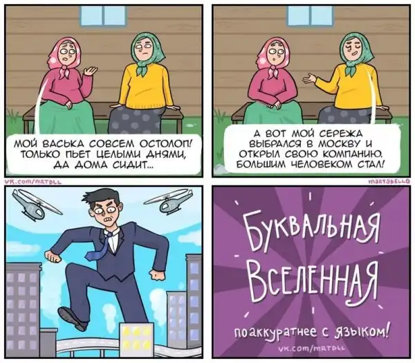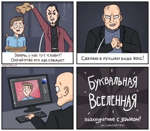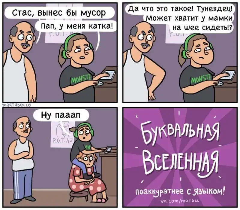 Автор комиксов под псевдонимом Martadello «проецирует жизнь в digital» и веселит нас сериями своих рисованных работ со своеобразными шуточками. Одним из таких циклов является «Буквальная вселенная», суть которой — превращать простые выражения с двумя и более смыслами в абсурдные визуальные истории.