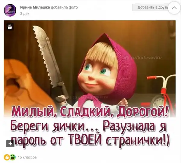 В подборке присутствуют: переписки, сообщения, фотографии, ну и просто анекдоты из ранее упомянутой соц. сети. :haha: