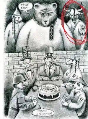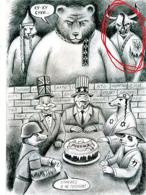 а вот это х*йло рогатое в красном овале что там делает? оно должно сидеть под столом и сосать у тех, кто за столом...