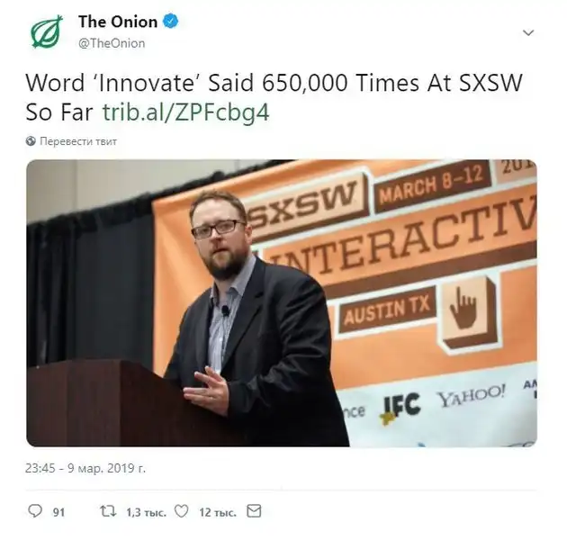 Подобным образом Илон Маск отреагировал на то, что в ходе прошедшего в Техасе фестиваля SXSW слово "инновация" было в общей сложности использовано почти 650 тысяч раз.