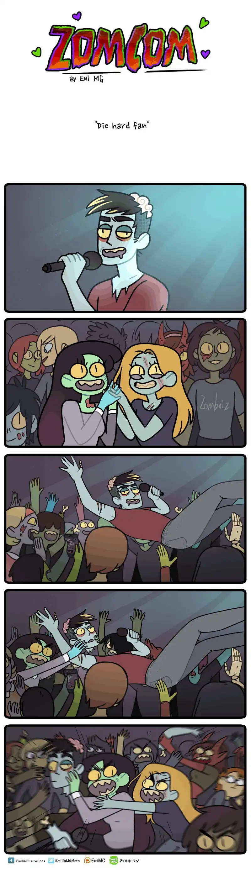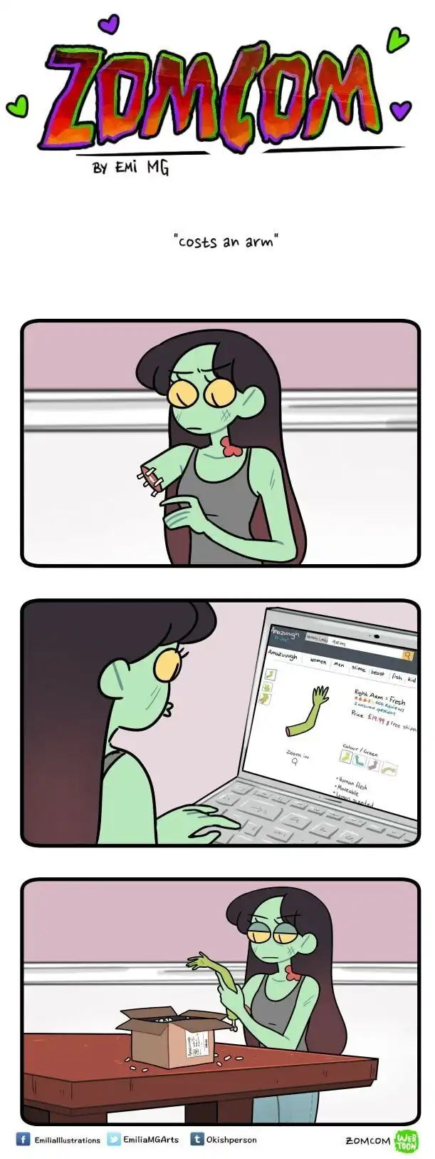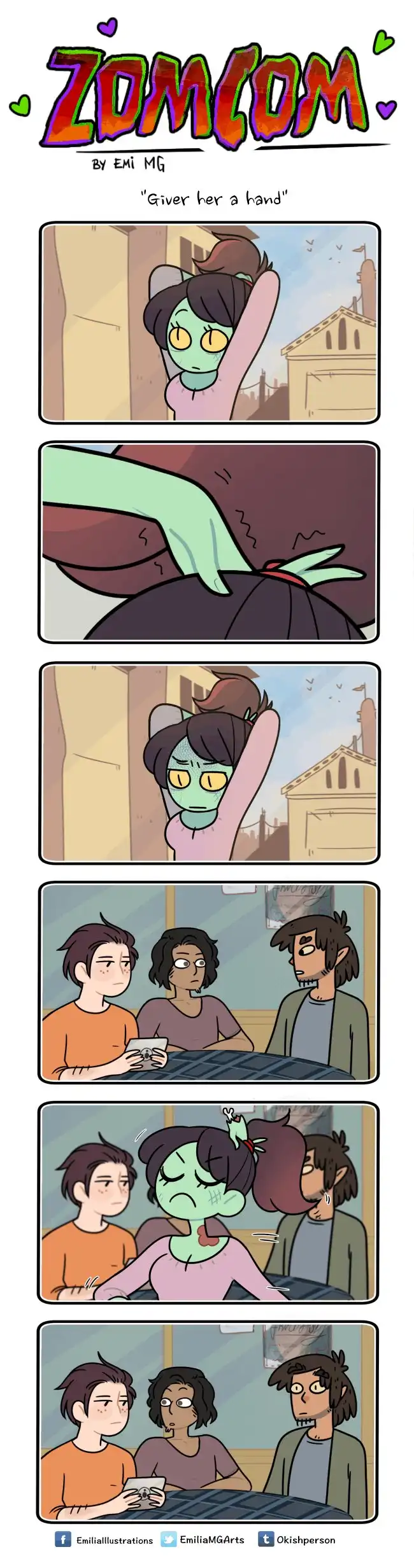 Зомби, оборотней и вампиров большинство из нас привыкло видеть только в качестве героев фильмов ужасов, где они предстают в самом неприглядном виде и кошмарят несчастных людей. Но у многих страшных бабаек есть и другая, более человечная сторона. Именно о ней и рассказывает в своих комиксах «ZomCom» британка по имени Эмилия.
