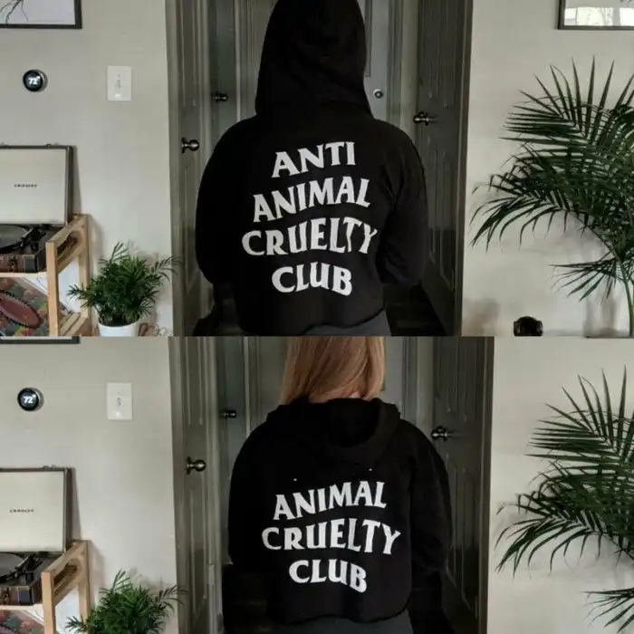 Надпись означает «Общество против жестокого обращения к животным», но стоит снять капюшон и она превращается в «Общество жестокого обращения к животным».