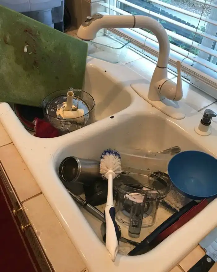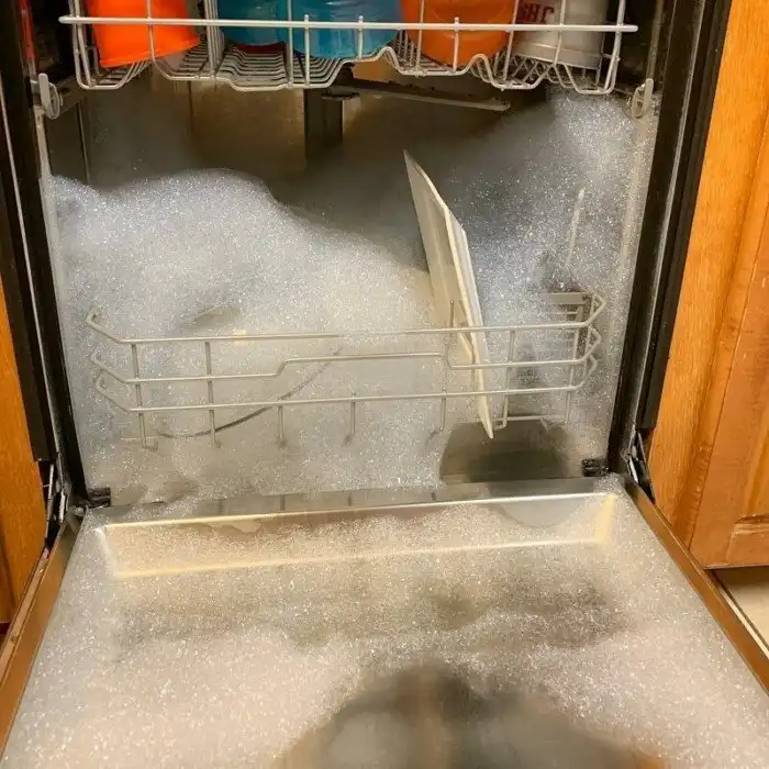 Когда жена уехала, а муж все-таки был вынужден помыть посуду. Зато на собственном опыте убедился, что для посудомойки нужно использовать не жидкое мыло, а специальные средства.