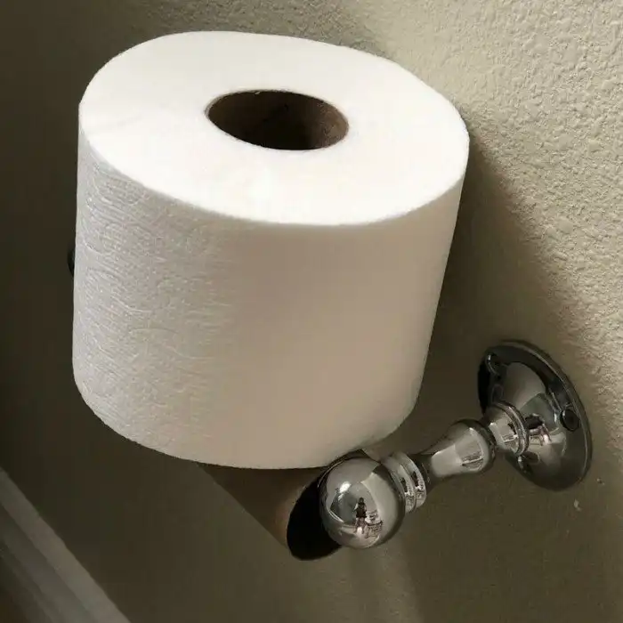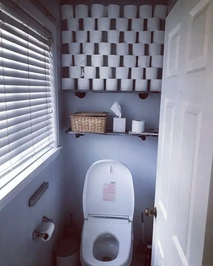 "Я попросила Скотта распаковать туалетную бумагу .... вместо милой 10-рулонной пирамиды, которую я обычно делаю, я получил этот шедевр, просто ожидающий удобного момента, чтобы рухнуть мне на голову".