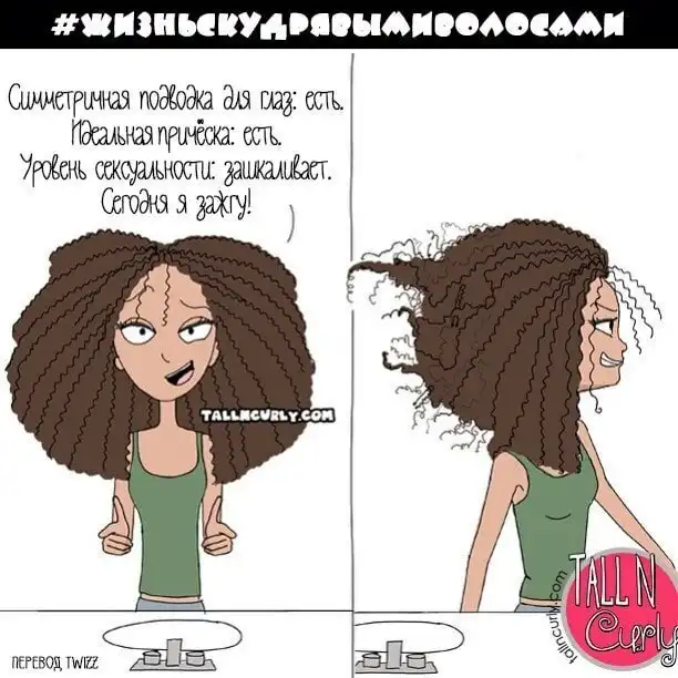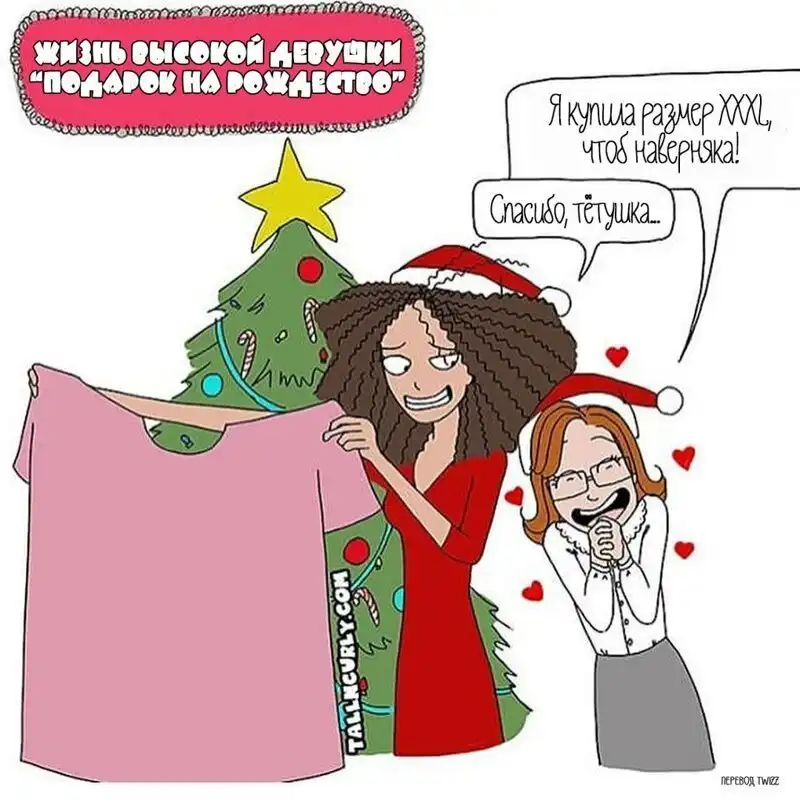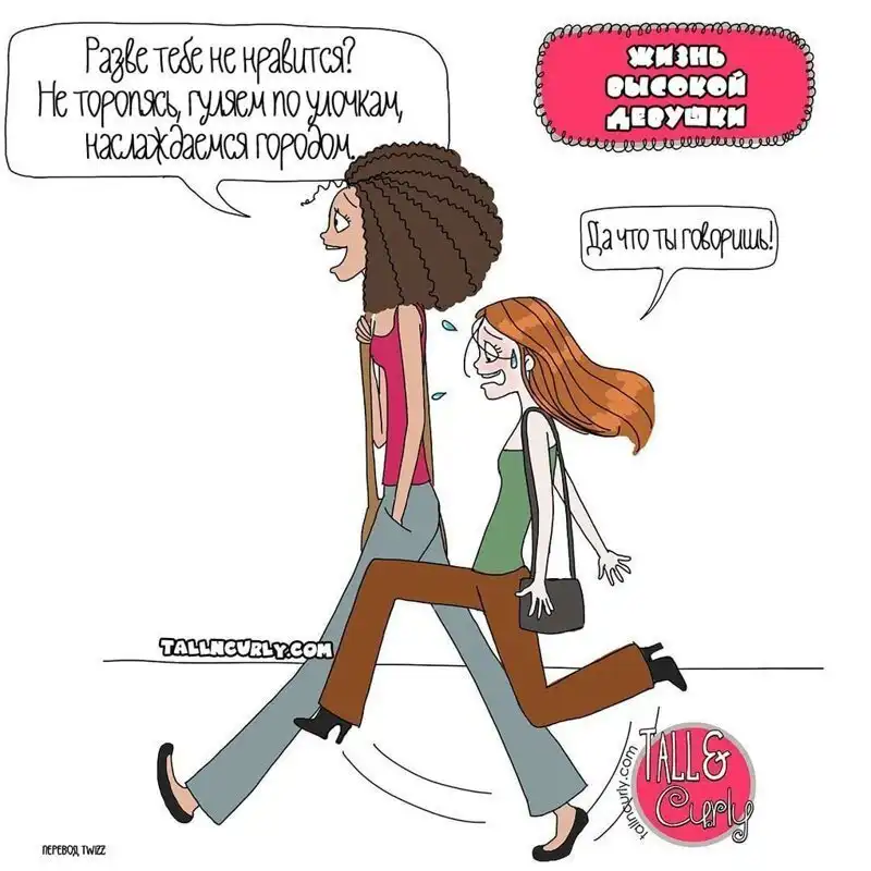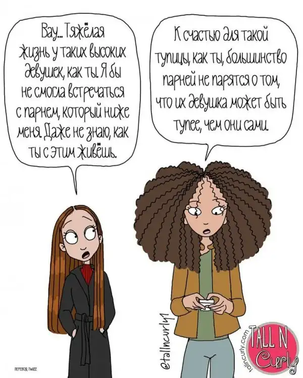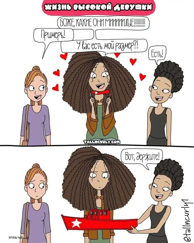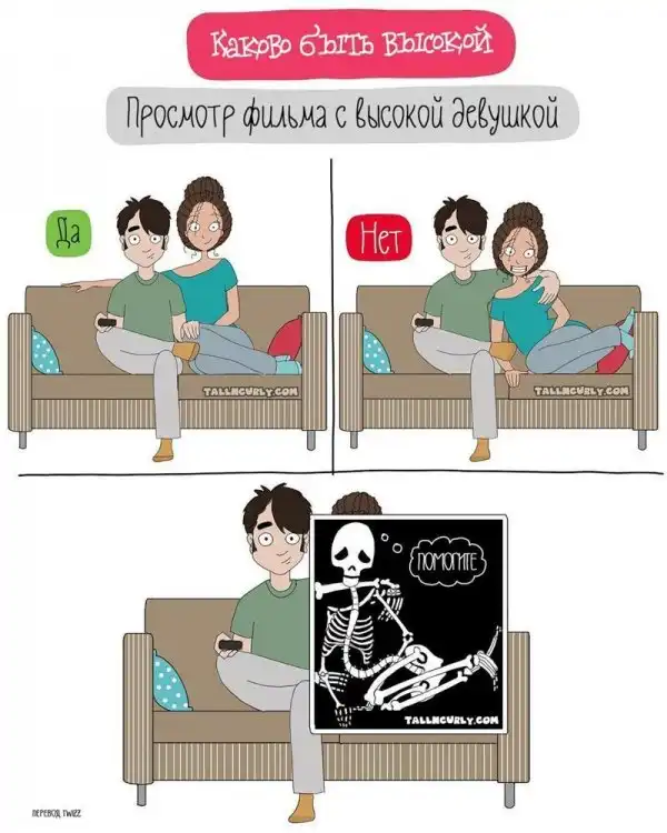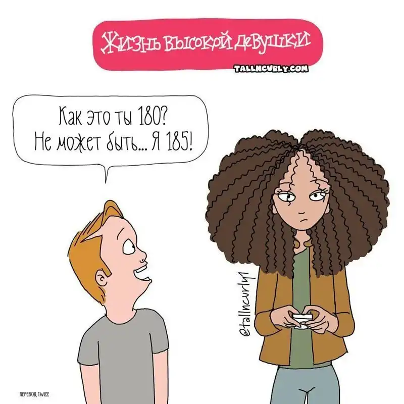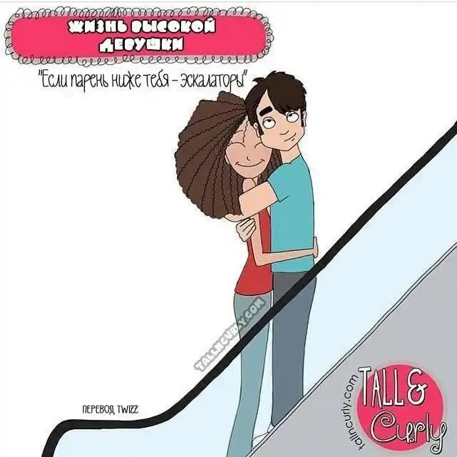 Одарённая и весьма высокая художница Чеян Лефевр, выступающая под псевдонимом tallncurly («высокая и кучерявая»), рисует комиксы о жизни со своими бойфрендом, ростом и кудряшками.