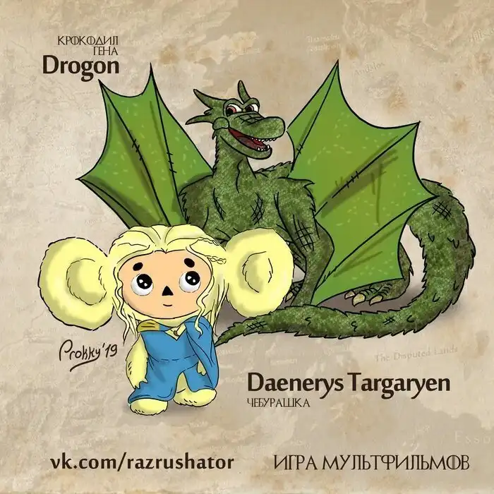 Чебурашка — единственный в своём роде, последний представитель династии. Прямо как Дейенерис. Ну а раз Дейенерис — мать драконов, то почему фем-версия Чебурашки не может стать матерью крокодилов?