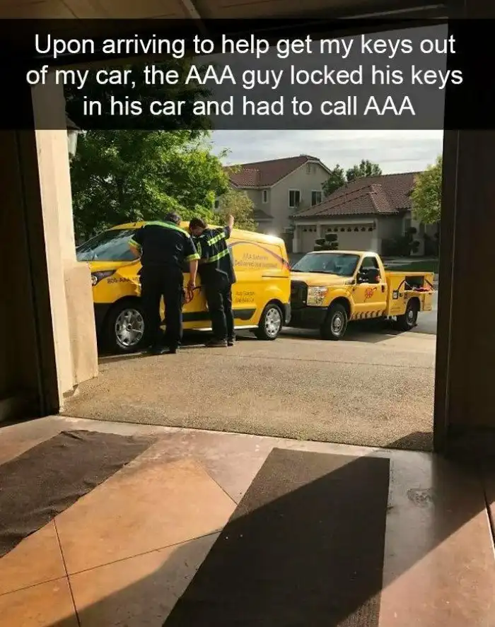 "Случайно запер ключи в машине. Водитель приехавшей на выручку машины техпомощи, торопясь, запер свои ключи в машине. Пришлось звать новую техпомощь".