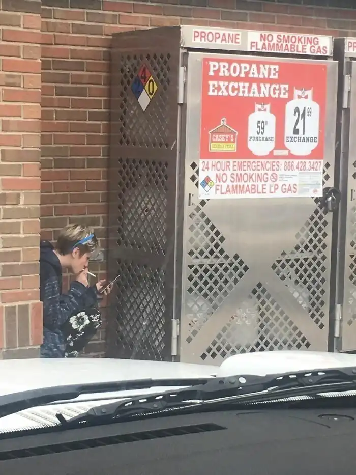Надпись на будке: "Пропан! Огнеопасно! Не курить!"
