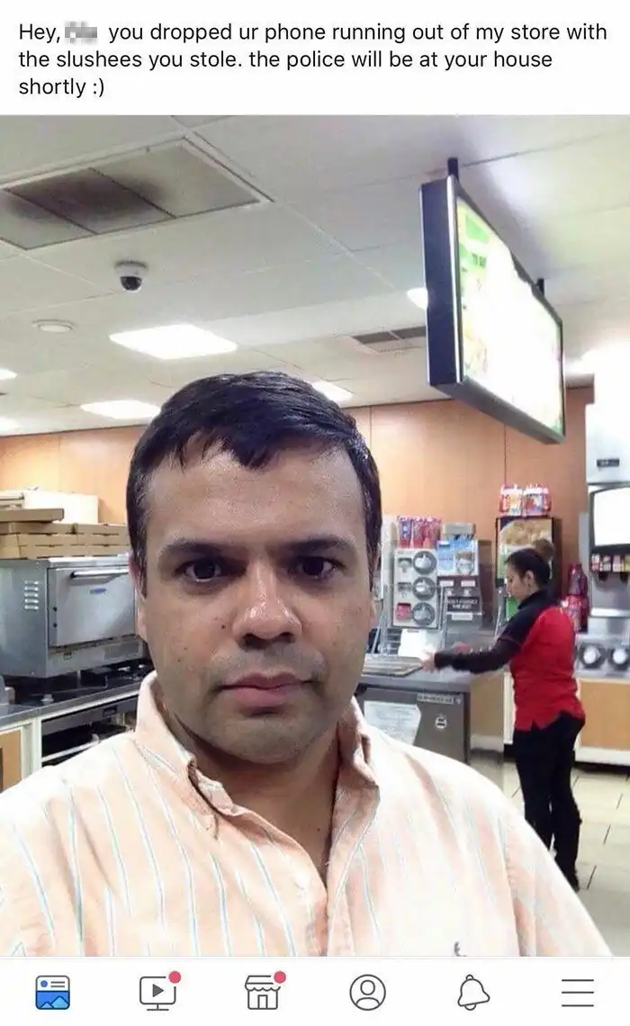 Директор магазина обратился к воришке, укравшей несколько коктейлей из его магазина, через соцсети. "Эй, ты уронила свой телефон, когда убегалаи с коктейлями, - сообщил он. - Так что полиция скоро подъедет прямо к тебе домой".
