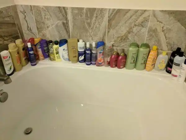 "А моя жена никогда не заканчивает старые бутылки с шампунем или гелем для душа, пока не купит новые"