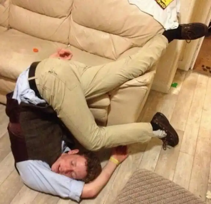 Спорим, вам не удастся принять такую позу? А эти люди не только принимают невероятные позы легко и непринужденно - они в них с комфортом спят! В чем секрет? Конечно, в алкоголе! Правда, вряд ли ассоциация цирковых акробатов согласится принять этих пьяниц в свои ряды!