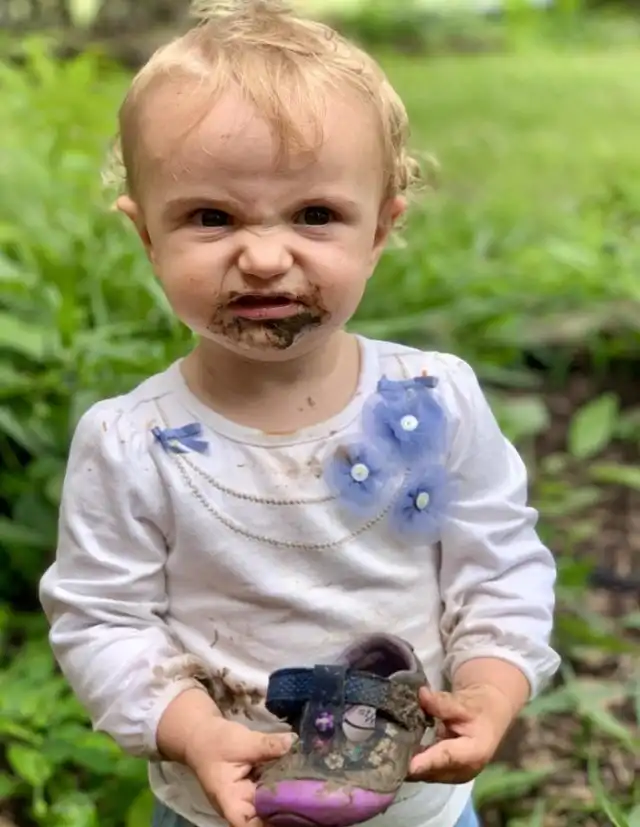 Лицо моей дочери, когда я прошу ее перестать есть грязь и надеть свою обувь"