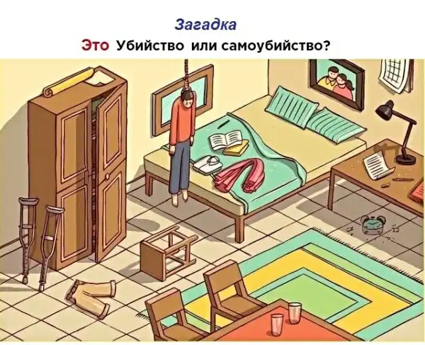 Вероятнее всего убийство. Там конечно всё писано вилами по воде, а какие то признаки(убийства) на такой картинке просто понять не возможно. Но самое очевидное по моему это костыли, стоящие далеко от тела. Хотя и этому можно придумать кучу оправданий. Но учитывая мультяшную картинку, следует принимать и её условности. Например тут не понятно, затянута ли веревка на шее, и доставали ли ноги жертвы до стула, а вот костыли видно явно.