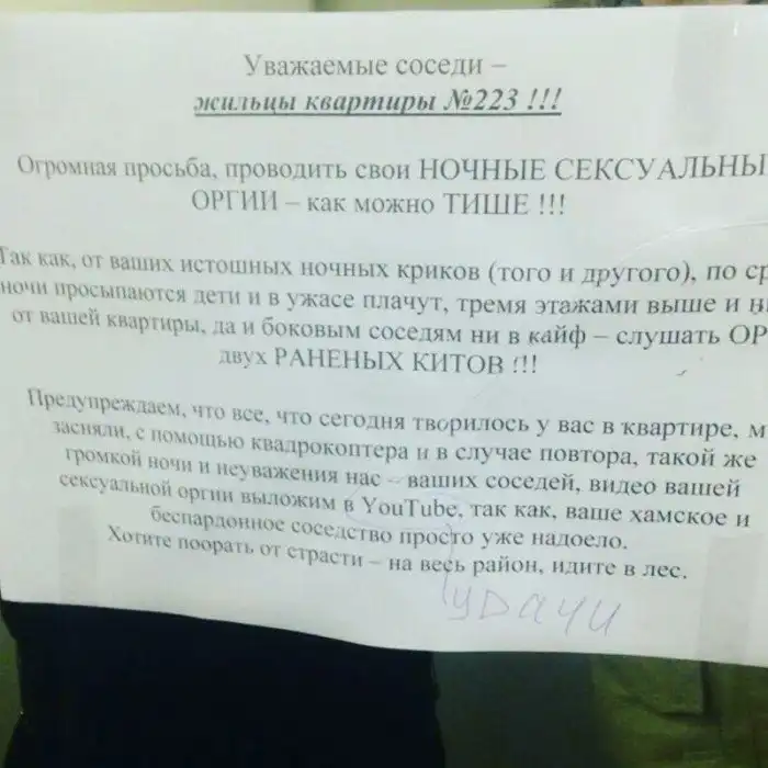 Музыка в 3 часа ночи, перфоратор в 7 утра воскресенья - знакомо? Иногда даже шумоизоляция не спасает! Сегодня можно лично не знать соседей, которые живут в квартире рядом, однако быть в курсе их ссор из-за хорошей слышимости. Мы собрали объявления и предупреждения, оставленные людьми, у которых лопнуло терпение.