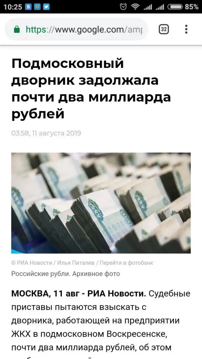 Матери одиночке придется работать 260 тысяч лет, чтобы отдать долг, который на нее повесили. В Воскресенске работница предприятия ЖКХ оказалась должна около двух миллиардов рублей. Несколько лет назад она устроилась на работу курьером и после собеседования подписала документы. Однако, она и сама не заметила как стала учредителем и главой фирмы, которая взяла в банке 32 миллиона долларов и обанкротилась. После этого работодатель уволил ее с должности дворника и теперь она одна без мужа и работы с маленьким ребенком на руках должна выплатить всю эту сумму. "Я ходила к адвокату, в суд подала. У меня проводили обыск. Я сижу на таблетках, нервный срыв" - передает женщина. Сейчас сумму постепенно забирают у нее из зарплаты в 15 тысяч рублей, оставляя ей всего половину. Такими темпами она выплатит всю сумму только через 260 тысяч лет...