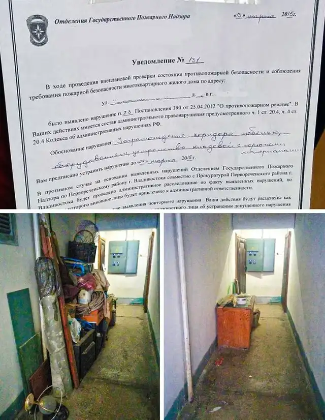 5. "Соседи друга складируют в проходе хлам: он мешает пройти, и запах там не очень. Друг сделал фейковое уведомление от пожарного надзора. Вот результат"