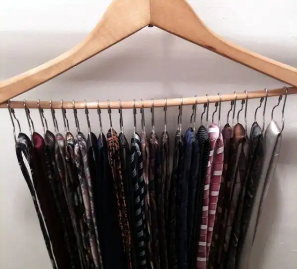 13. Возьмите вешалку и кольца для душевой шторки, чтобы повесить мелкие предметы гардероба: ремни, галстуки и т. д