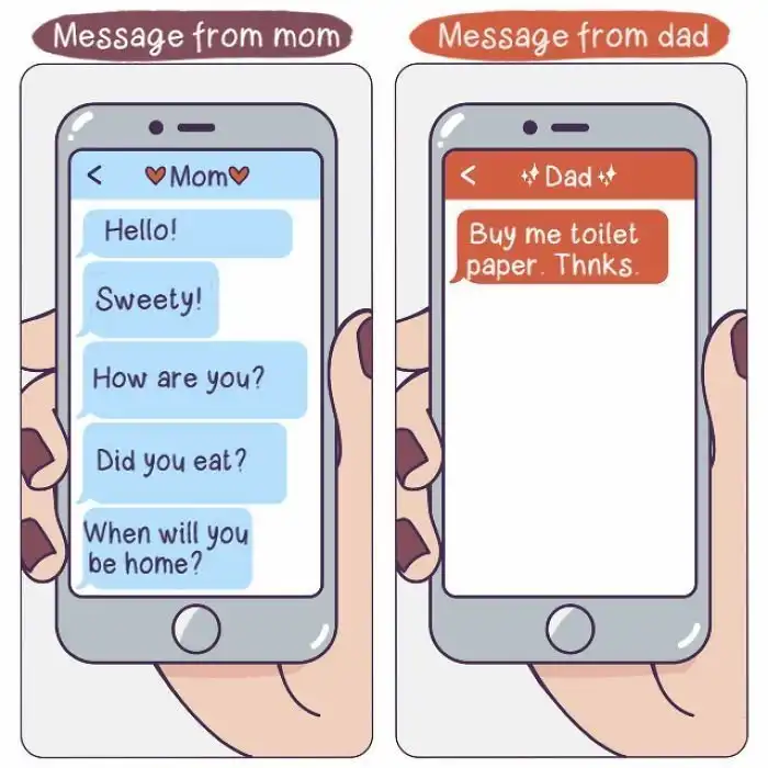 Смс-ка от мамы: "Привет, солнышко! Как дела? Ты кушала? Когда будешь дома?" Смс-ка от папы: "Купи туалетной бумаги. Па".