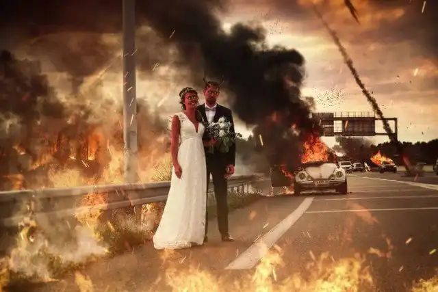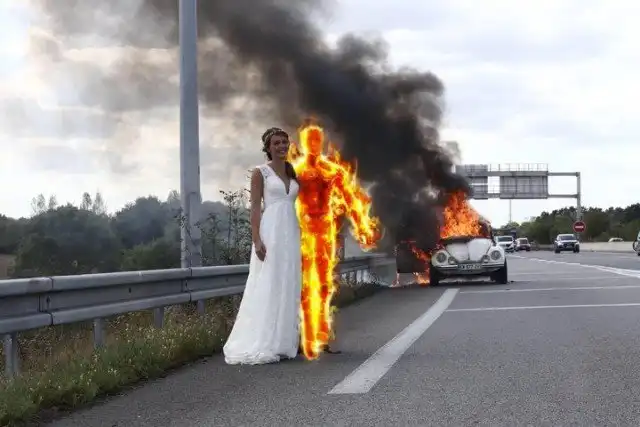 Молодожены сфотографировались возле горящей машины и стали героями фотожаб.