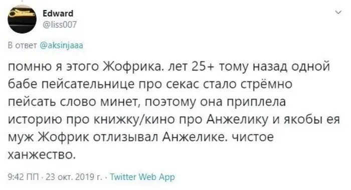Спешим вам рассказать, что Жофрей - персонаж романов супругов Голон об Анжелике. Этот мужчина, вопреки своему уродству, завоевал любовь главной героини и прославился своим умением доставлять ей оральные ласки с помощью фаллоимитатора.