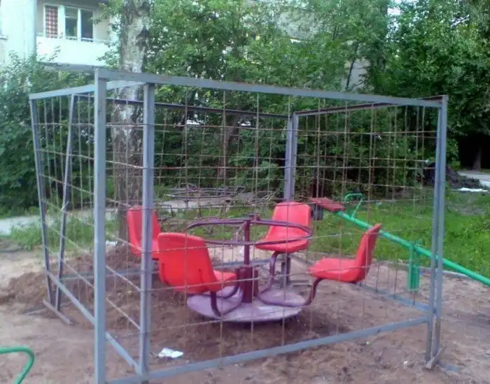Некоторые полагают, что это детские площадки защищают от вандалов и извращенцев. Но по факту места пребывания детей обносят колючкой, чтобы хоть как-то обезопасить себя от малышей и малышек.