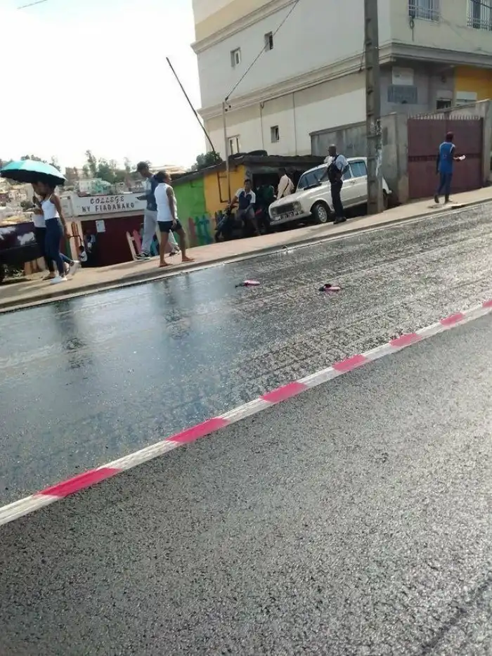 Асфальт только положили, а какой-то парень пытался перебежать дорогу. Сланцев он лишился, интересно, что с ногами?