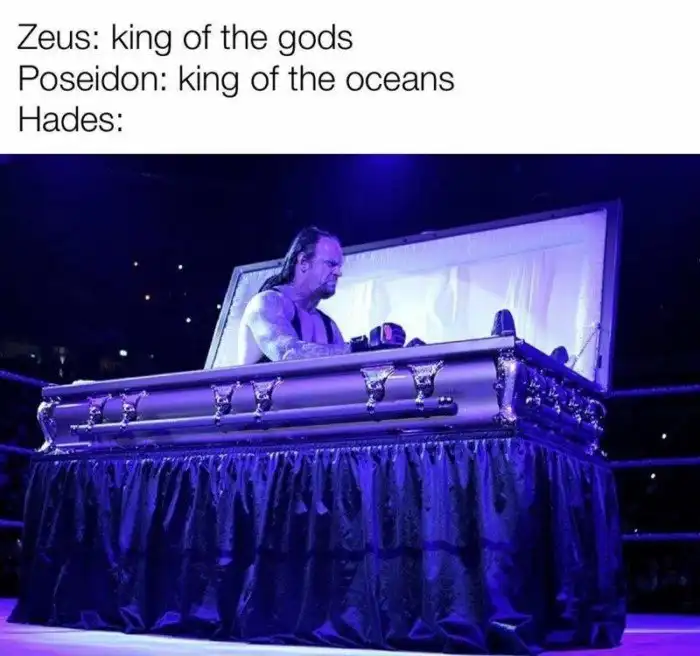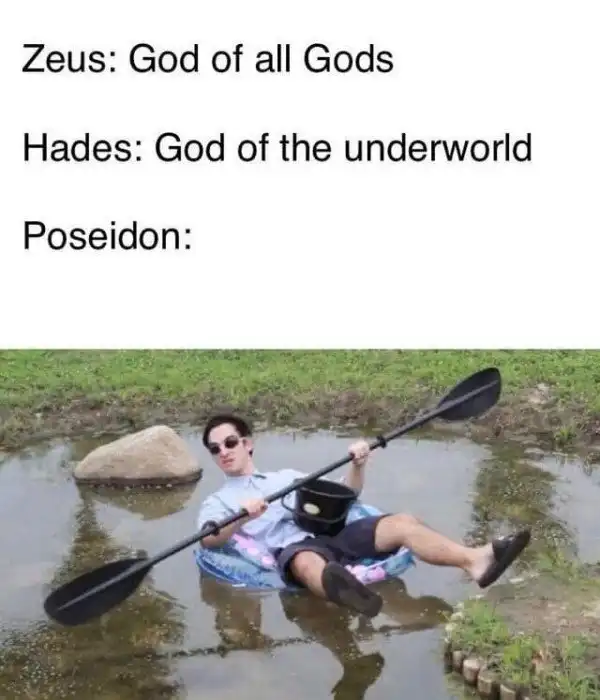 Мем устроен проще простого. Сначала идёт Зевс, который описывается, как бог всех богов, начальник и повелитель грома и молнии. Затем другой бог, в подавляющем большинстве случаев Аид, повелитель подземного царства. Ну и на десерт — главный герой, которого и опишет смешная картинка, следующая за ним.