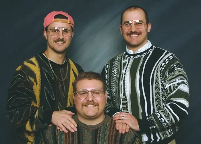 Подобрали одежду, аксессуары (вы только взгляните на эти свитера, очки и розовую бейсболку козырьком назад!), - все это прямо-таки взрыв из прошлого